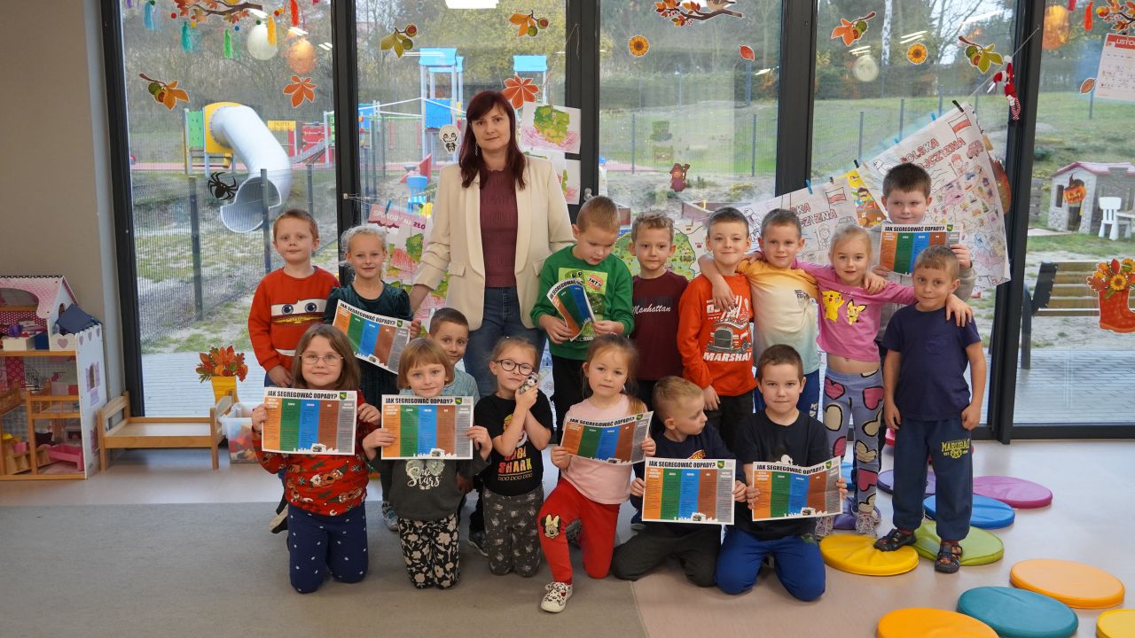 14 listopada 2025 r. grupę OA odwiedziła Pani Małgorzata Makuch Inspektor ds. gospodarki odpadami. Podczas spotkania odbyły się zajęcia edukacyjne, w ramach których najmłodsi mieszkańcy naszej gminy zapoznali się z procesem segregacji odpadów komunalnych.