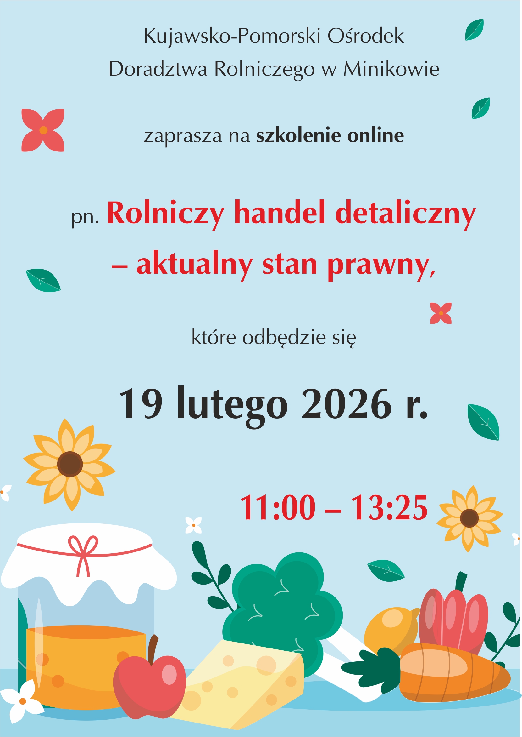 Kujawsko-Pomorski Ośrodek Doradztwa Rolniczego w Minikowiezaprasza na bezpłatne szkolenie pn. „Rolniczy Handel Detaliczny – aktualny stan prawny” organizowane w dniu 9 lutego 2026r. w godz. 11:00-13:25.