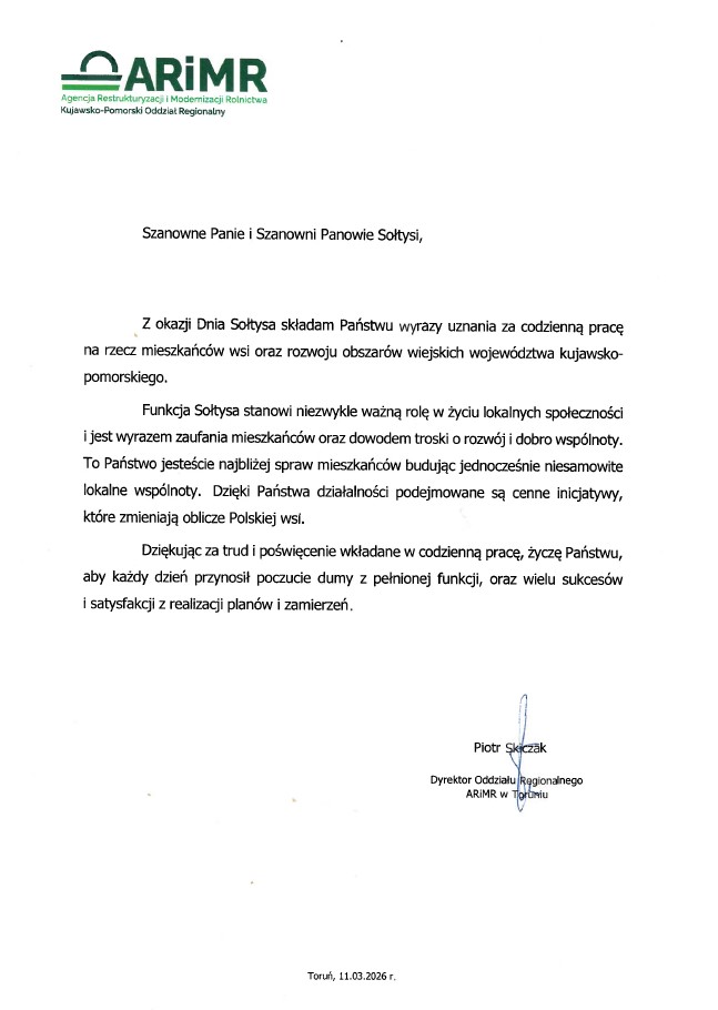Z okazji Dnia Sołtysa zamieszczamy list okolicznościowy z życzeniami od Pana Piotra Skiczaka Dyrektora Oddziału Regionalnego Agencji Restrukturyzacji i Modernizacji Rolnictwa