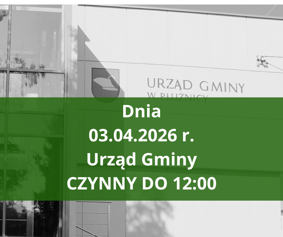 Informujemy, iż dnia 3 KWIETNIA 2026 r (piątek) Urząd Gminny w Płużnicy będzie czynny do godziny 12:00.