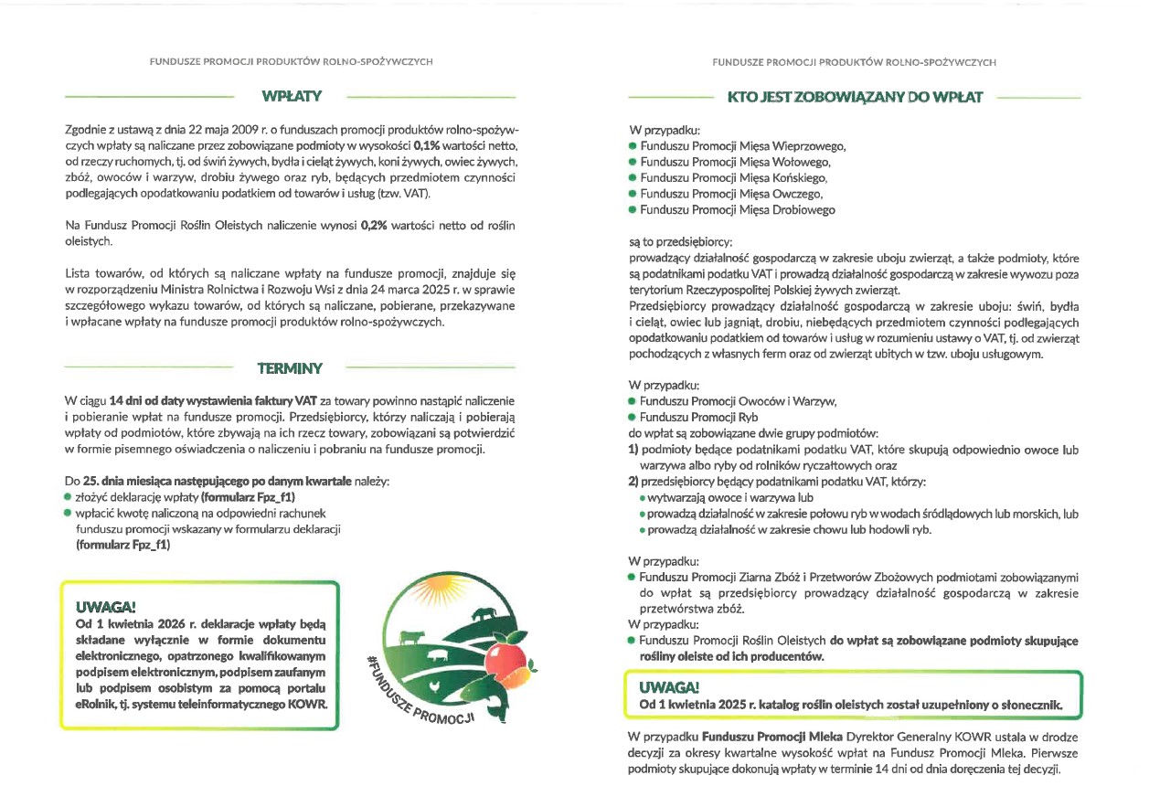 Nowelizacja ustawy o funduszach promocji produktów rolno-spożywczych z dnia 21 lutego 2025 r. (Dz. U. z 2025 r. poz. 683) wprowadza od dnia 1 kwietnia 2026 r. obowiązek składania deklaracji wpłat na fundusze promocji wyłącznie za pośrednictwem systemu teleinformatycznego KOWR, tj. poprzez platformę usług e-Rolnik: https://erolnik.gov.pl/#/